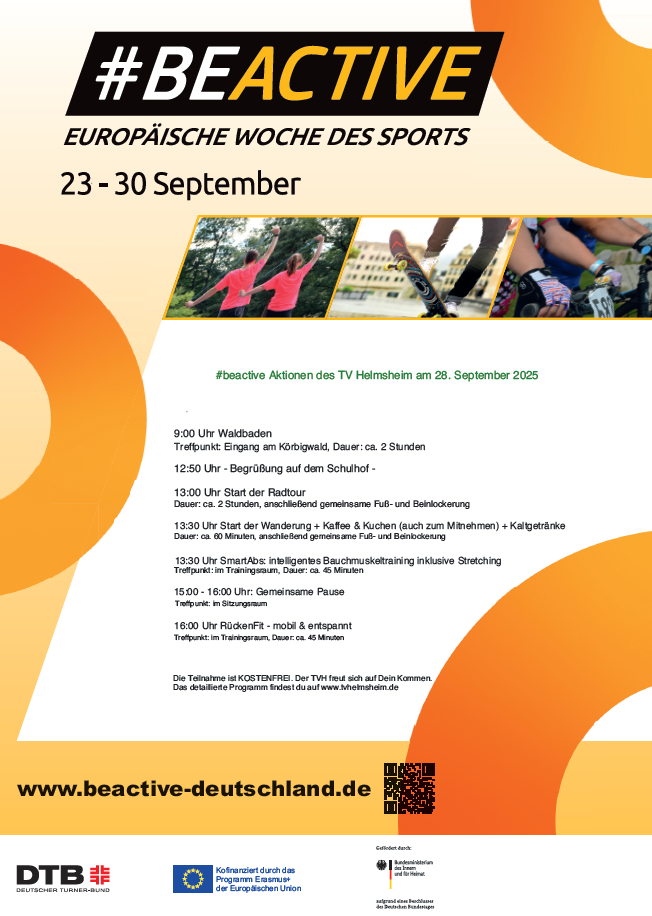 - Während der #BeActive Woche vom 23. bis 30. September bieten wir allen Erwachsenen, die sich für eine Mitgliedschaft entscheiden, eine exklusive Aktion an: Du zahlst den Mitgliedsbeitrag erst ab dem nächsten Jahr! Das bedeutet, dass Du die verbleibenden Monate dieses Jahres kostenlos trainieren und an unseren Sportveranstaltungen teilnehmen kannst.